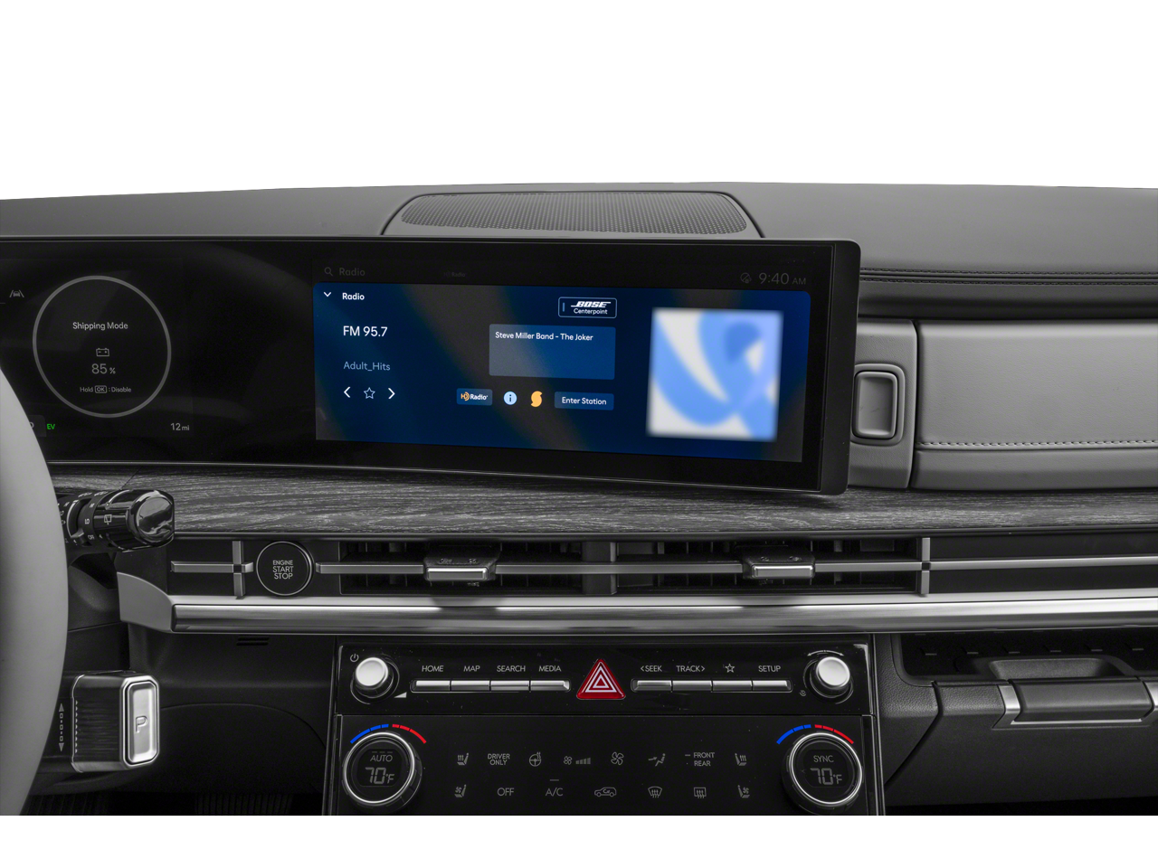 - Radio: AM/FM/HD Bose Premium Audio System -inc: 12 speakers including subwoofer, external amplifier, 12.3" wide touchscreen, Apple CarPlay and Android Auto, Bluetooth® hands-free w/wireless audio streaming, dynamic voice recognition, USB connectivity, SiriusXM, wifi hotspot, Blue Link connected car system, navigation system including traffic flow w/incident data via HD Radio (HERE), OTA updates (map only) and rear seat quiet mode